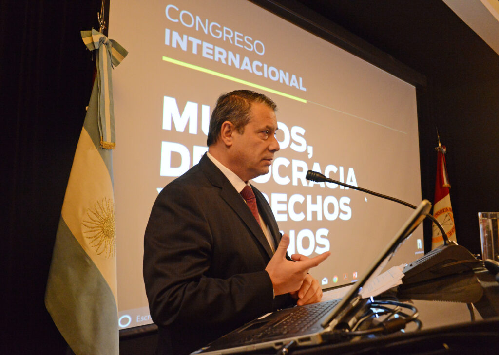 Guillermo Whpei analiza el impacto del sistema económico global en los derechos humanos durante una presentación en un foro internacional.
