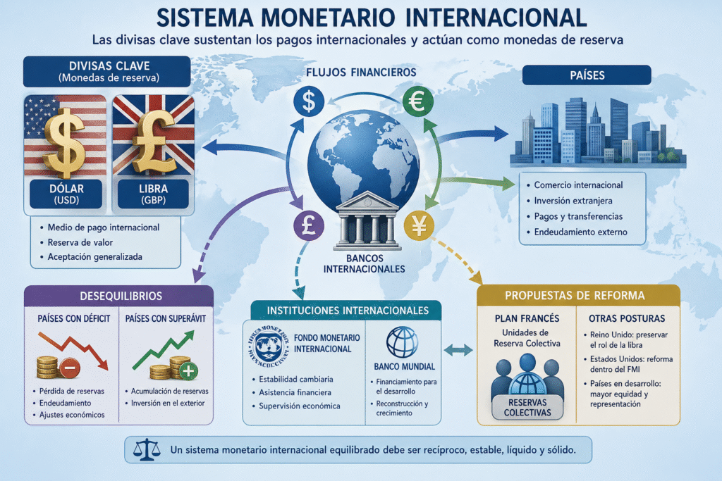 Existe en la expresión misma más que una paradoja una contradicción. Moneda fuerte a causa de la potencia económica de los Estados Unidos, el dólar es cada vez menos solicitado al parecer cada vez más dudosa su convertibilidad efectiva en oro. En estas condiciones, hay que reformar el sistema monetario internacional con el fin de que pueda responder a los cuatro criterios fundamentales definidos por el Ministro de Hacienda francés. Desgraciadamente existe una tal “inflación” de planes de reforma, que resulta difícil separar los principios fundamentales que se complementan o se oponen. El plan francés y el plan presentado por Gran Bretaña son radicalmente opuestos: uno tiende a reducir la importancia de las divisas claves y el otro tiende a salvaguardar el papel internacional de la libra. Los Estados Unidos no presentan, oficialmente, ningún plan específico. Sin embargo, piden que cualquier reforma se efectúe en el marco del F. M. I. donde su influencia es institucionalmente preponderante. Francia insiste en la necesidad de que los Estados Unidos reequilibre su balanza de pagos; el ministro de Hacienda americano replica señalando la importancia de que los países con excedentes ajusten su posición de la misma manera que aquellos que tienen déficits. El interés nacional orienta, por todos lados, la búsqueda de nuevos sistemas.